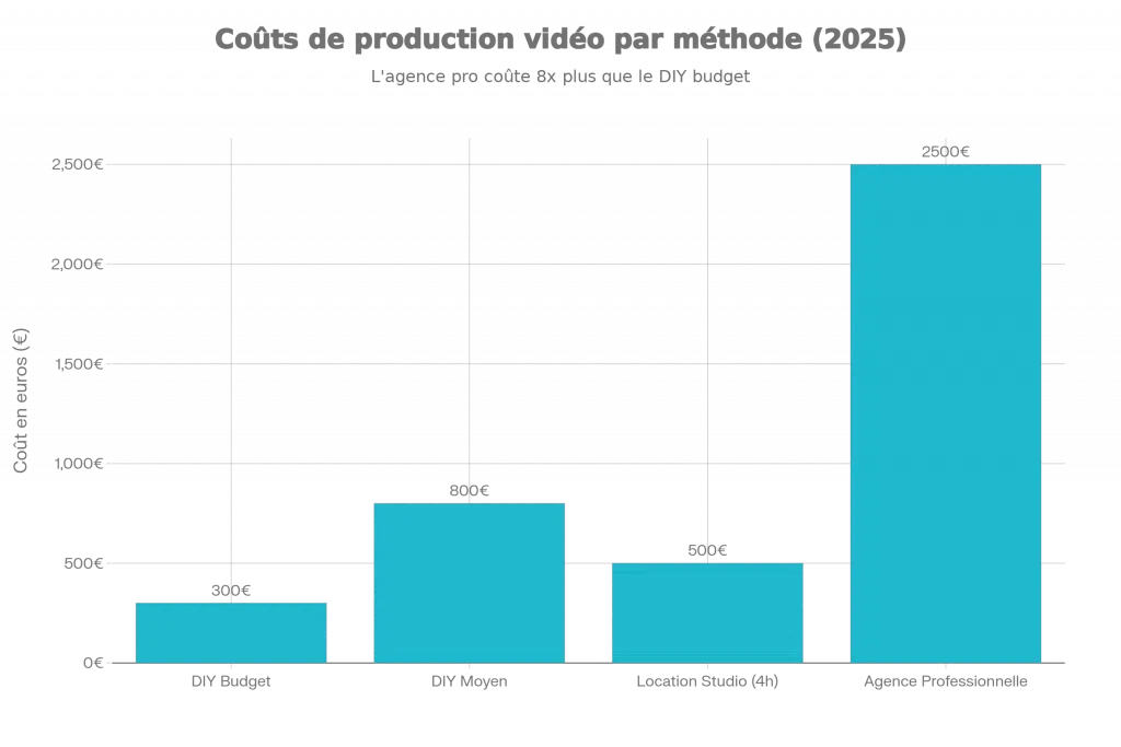 Une personne + 1 micro + 1 caméra + fond simple (studio partagé) = vidéo de testimonial impactante. Coût : 150-250 € par interview.